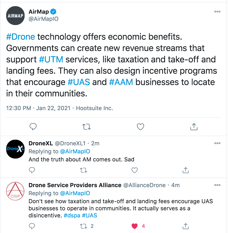 Well Airmap just tweeted that “Governments can create new revenue streams….like taxation of take off’s and landings.”
