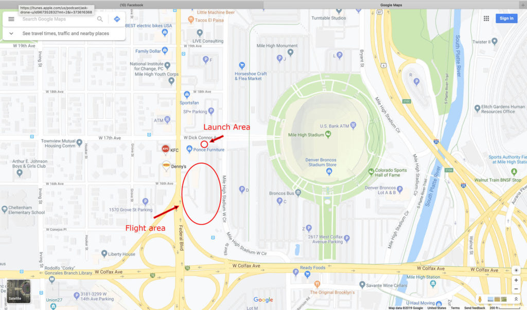 Everything was good so far. We knew that flying from any property owned by Mile High Stadium was off-limits, so we asked if we could fly from an adjacent parking lot. We were told no, so we decided to fly from a sidewalk, which we knew was legal. We wanted a parking lot to be away from crowds. Obviously, that would have been the safest route. But that ended up not being an option.